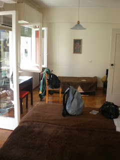 We arrived at about 1:30 saturday afternoon to a cold, windy, rainy city. I had done enough research to know that the metro ran from the airport straight to the heart of the city. Well, go figure, the metro just happened to be closed from the airport to the next stop so we had to figure out another way. We asked someone and they told us to take a bus. They pointed at which one adn told us to get on. We did so and had no idea where we were headed. It seemed that nobody really knew. But eventually we figured that it was going to an area close to where we wanted to be. We stayed on til the end and when we got off, the rain had stopped. I had already picked out a few hotels that I thought would be good choices, and we figured out where we were and headed towards the closest one. We found it without a problem and I think we were the only people there. It was really nice, in a great location, at a super cheap price, and included breakfast. The guy showed us a few rooms and let us choose what we wanted. We chose one with 2 balconies, with a partial view of the acropolis, and lots of space. here are some pictures of the room and the views from it: